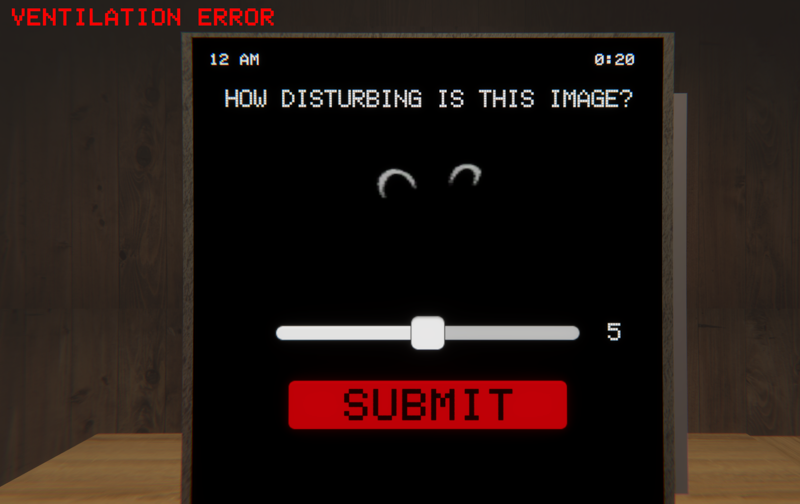 A survival psychological horror inspired by the FNAF series. You need to choose which character seems disturbing to you and how much while also keeping yourself alive by restoring ventillation each time it fails and keeping the intruder away...